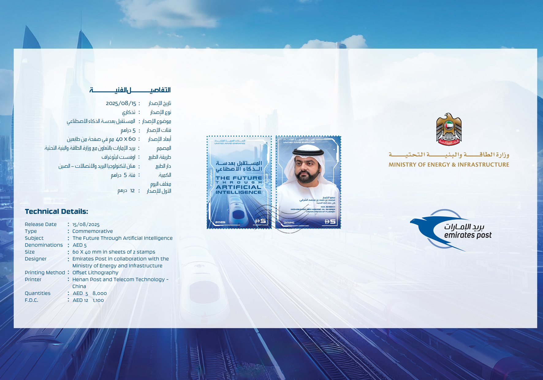 Celebrating the inauguration of the first fully integrated digital government services centre, in the emirate of Fujairah, Emirates Post has issued a special set of commemorative stamps, in collaboration with the Ministry of Energy and Infrastructure, featuring H.H. Sheikh Mohammed bin Hamad bin Mohammed Al Sharqi, Crown Prince of Fujairah, marking a historic milestone in the United Arab Emirates’ digital government transformation journey.